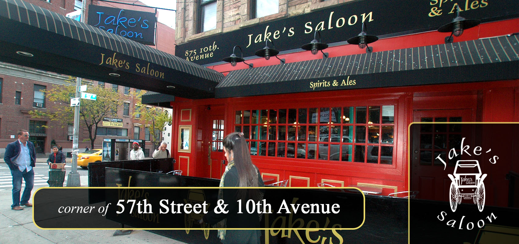 This Jake's Saloon is located at 875 10th Avenue (corner of 57th Street) in the Hell's Kitchen neighborhood of Manhattan, New York.
